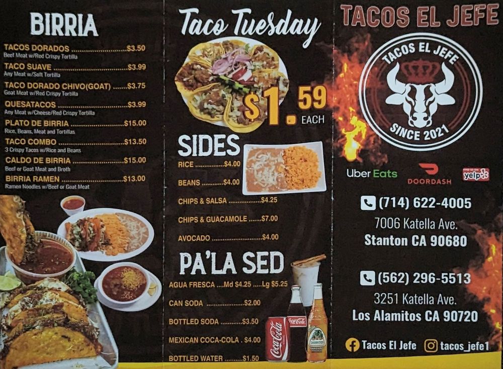 Introducing Tacos El Jefe, located in Stanton, CA, this taco spot offers a variety of options for both meat lovers and vegetarians. With a casual ambiance and outdoor seating, it's perfect for lunch or dinner with friends. The menu features classic tacos like Asada, Chorizo, and Pollo, as well as unique options like Tripe and Tongue. Try the Family Packs for a convenient meal with rice, beans, and birria. Don't miss out on the House Specials like the Taco Jefe with cheese, asada, shrimp, and guacamole. Customers rave about the delicious flavors and generous portions. While the prices may be a bit higher for delivery, the quality of the food makes it worth it. Tacos El Jefe is a must-visit for authentic Mexican cuisine lovers.